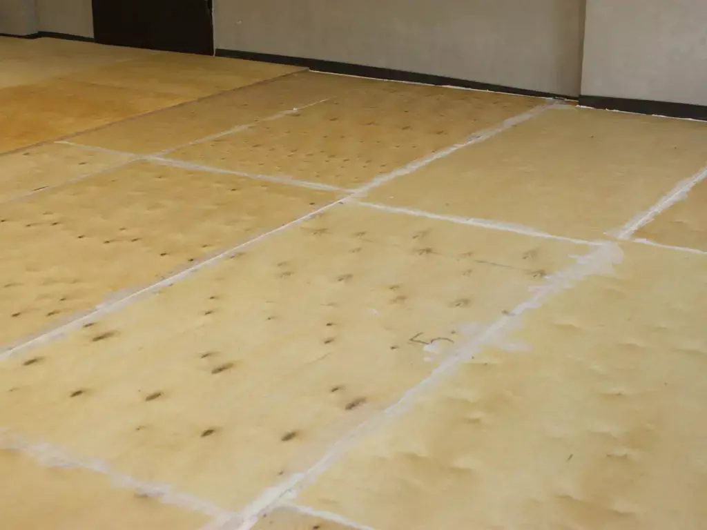 По лагам выполняется деревянный настил пола из листов фанеры в 2-3 слоя (общая толщина настила должна составлять 3-4 см). Слои настила должны перекрывать друг друга, не давая стыкам совпасть. Первый слой фанеры укладывается на лаги через демпфирующую ленту МаксФорте. Между собой слои фанеры следует промазать слоем однокомпонентной резины МаксФорте-ГидроСтоп и стянуть саморезами. Важно! Настил из фанеры не должен жестко примыкать к стенам.