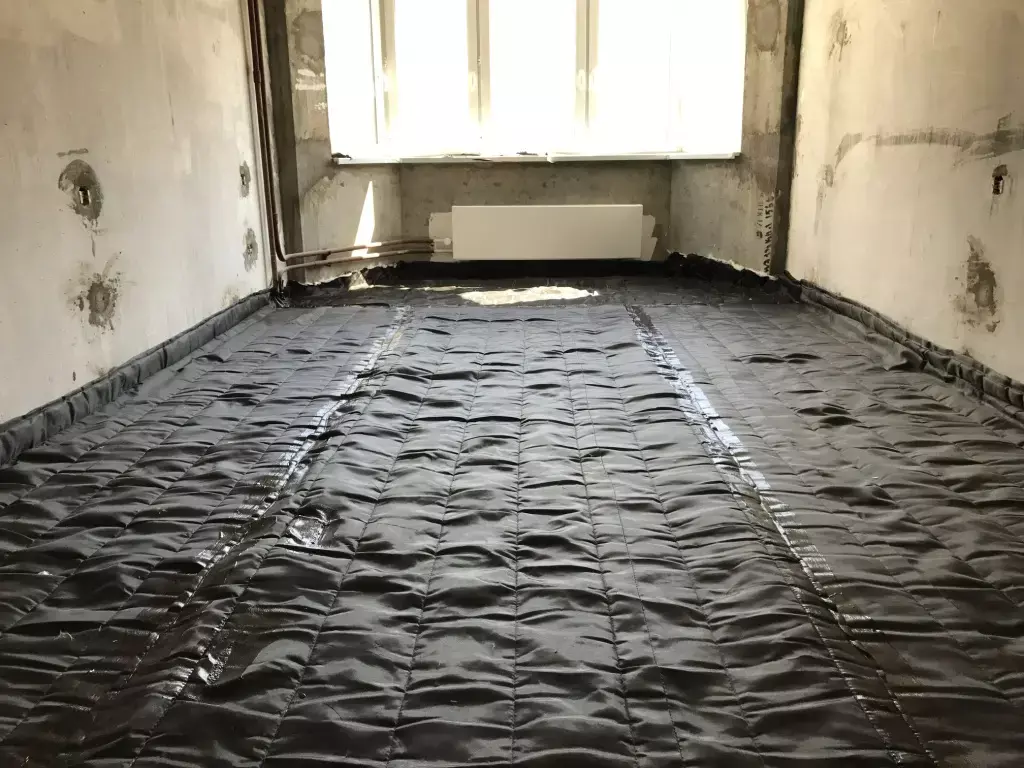 Разложить рулоны МаксФорте ЭКО.МАТ на выровненный пол так, чтобы получилось своего рода «корыто»: края рулонов МаксФорте ЭКО.МАТдолжны заходить на стены на высоту будущего чистового пола (лучше с небольшим запасом: лишнее легко можно впоследствии обрезать, а недостающую высоту прокладки между стяжкой и стенами подложить уже не получится). Стыки между рулонами МаксФорте ЭКО.МАТ проклеиваются серым армирующим скотчем.