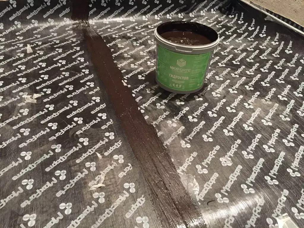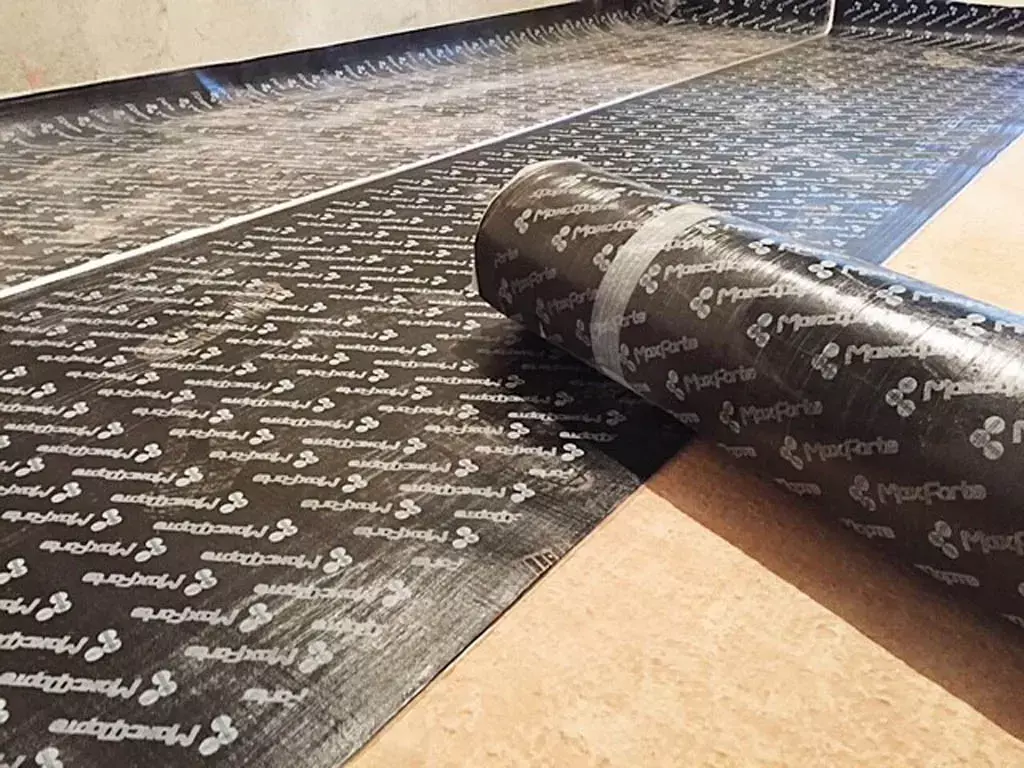 Рулоны нужно укладывать «стык в стык» или «на хлёст», стыки между рулонами МаксФорте - ШумоИзол тщательно замазываются жидкой резиной МаксФорте, либо проклеиваются строительным скотчем. Далее заливается стяжка 50-70мм с поверхностной плотностью ≥ 100 кг/м². Марка бетона М300.