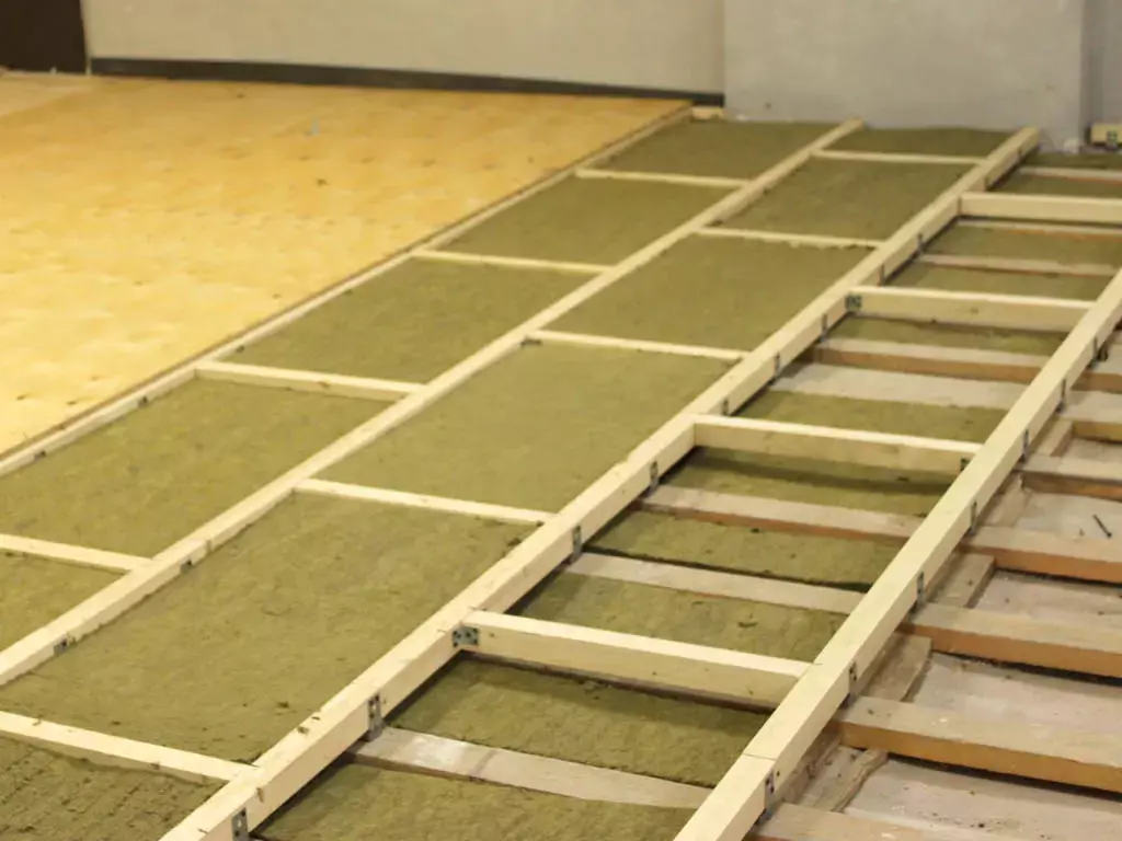 Звукоизоляционные плавающие полы по лагам эффективно применяются в процессе реконструкции зданий с деревянными перекрытиями (не допускается использование массивных стяжек), а также в квартирах с готовым ремонтом, когда проведение мокрых работ невозможно. Конструкция пола на лагах – проверенное решение, эффективно изолирующее как ударные, так и воздушные шумы. Быстрый монтаж и простота конструкции делают пол на лагах привлекательным вариантом звукоизоляции пола!