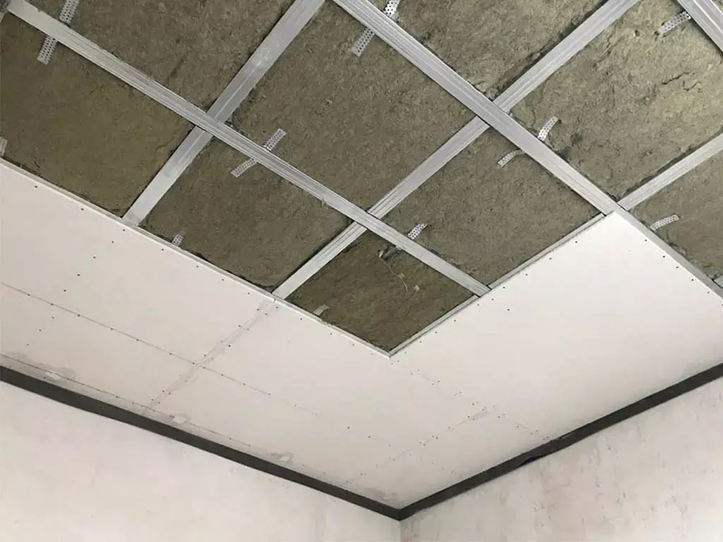 Осуществить монтаж Акустического гипсокартона толщиной 12,5 мм. Стыки листов гипсокартона в дельнейшем шпаклюются, обрабатывать герметиком их не нужно.