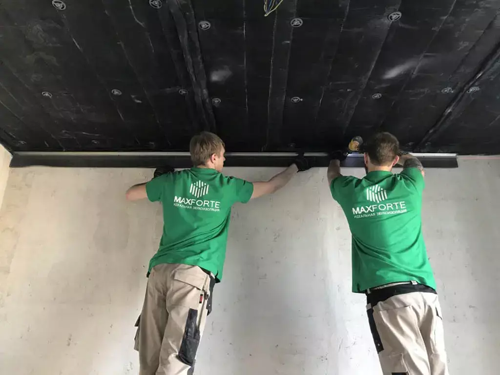 После установки звукоизоляции потолка необходимо обрезать выступающие остатки демпфирующей ленты и обработать швы по периметру (т.е. примыкания звукоизолирующей конструкции к стенам, полу, потолку) не твердеющим виброакустическим герметиком МаксФорте. Применение монтажной пены недопустимо!
