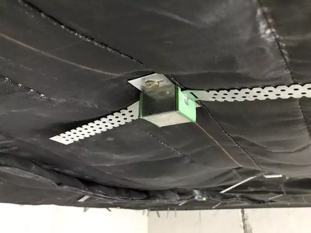 Закрепить рулоны МаксФорте Эко.Мат к потолку по всей площади, используя дюбель-грибы или рондоли. Рулоны нужно укладывать внахлест на 4-5 см. Стыки между рулонами МаксФорте Эко.Мат заклеиваются монтажным скотчем с армированием.