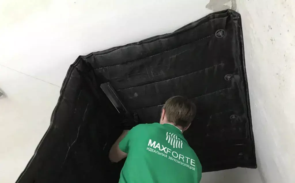 Закрепить рулоны МаксФорте Эко.Мат к потолку по всей площади, используя дюбель-грибы или рондоли. Рулоны нужно укладывать внахлест на 4-5 см. Стыки между рулонами МаксФорте Изол.Мат заклеиваются монтажным скотчем с армированием.