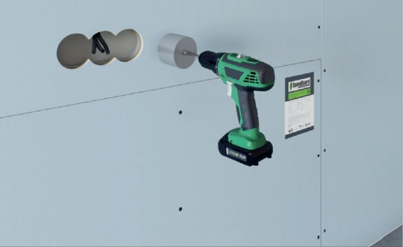После монтажа звукоизоляционного гипсокартона SoundGuard Gipsofon в нем коронкой просверливается отверстие в месте установки подрозетника.