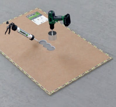После монтажа звукоизоляционного гипсокартона Gipsofon ПЛУК в нем коронкой просверливается отверстие в месте установки подрозетника.