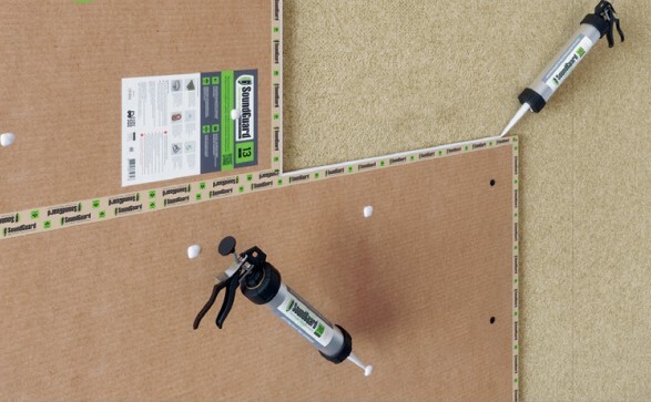 Виброакустичекий герметик SoundGuard Seal наносится на грани панелей в процессе их монтажа и в местах установки дюбель-гвоздей.