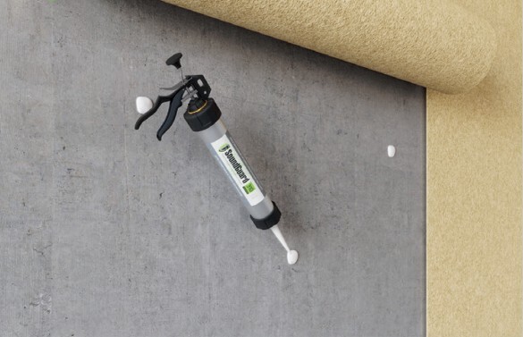 К стене крепится подложка виброакустическая SoundGuard VibroRoll на небольшое количество точечно нанесенного герметика SoundGuard Seal.