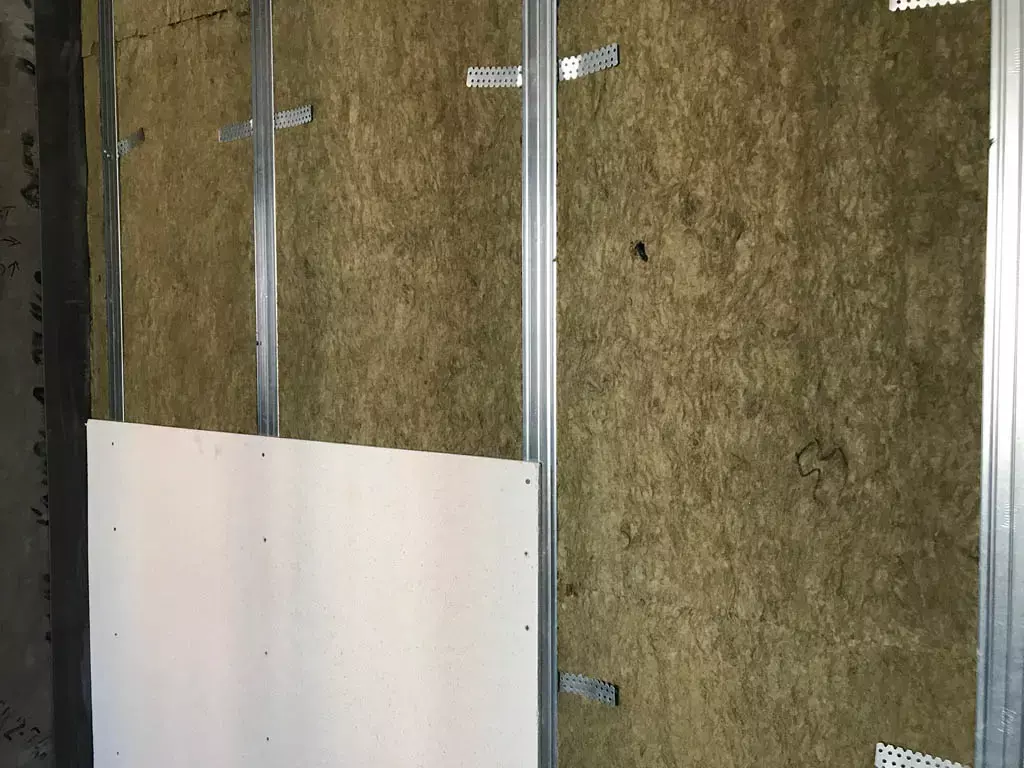 Плитами звукопоглощающего материала МаксФорте – ЭКОплита Slim плотно заполнить пространство между профилями металлокаркаса. Эти звукопоглощающие плиты специально предназначены для тонкой звукоизоляции с профилем КНАУФ ПП 60/27 мм (имеют толщину всего 30 мм).