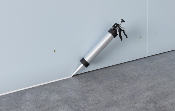 Между торцами листов гипсокартона и поверхностями пола, стен и потолка остается зазор 3 – 5 мм, который заполняется герметиком SoundGuard Seal.