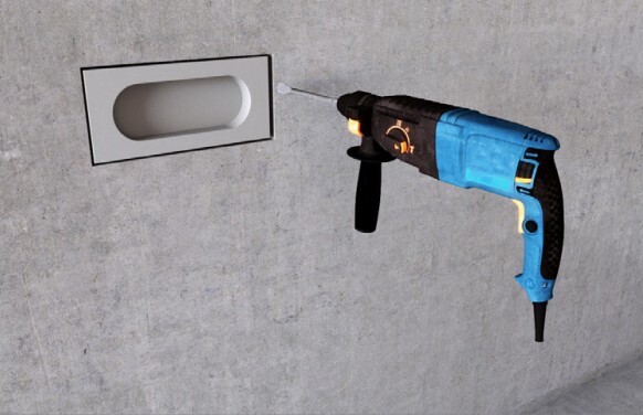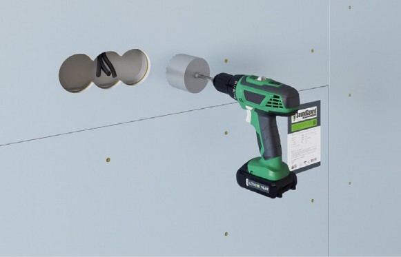После монтажа звукоизоляционного гипсокартона в нем коронкой просверливается отверстие на месте установки подрозетника SoundGuard ИзоБокс Стандарт. Электрический подрозетник прикручивается к внутренней плоскости короба саморезами.
